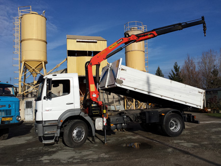 Mercedes Axor 1823 Palfinger Performance 12000 fülke mögötti daruval felszerelve. A daru teherbírása 4000 kg, hossza 8,5 m. Platóméret 4,5*2,55 m (3 oldalra billenős). Az autó teherbírása 8700 kg.